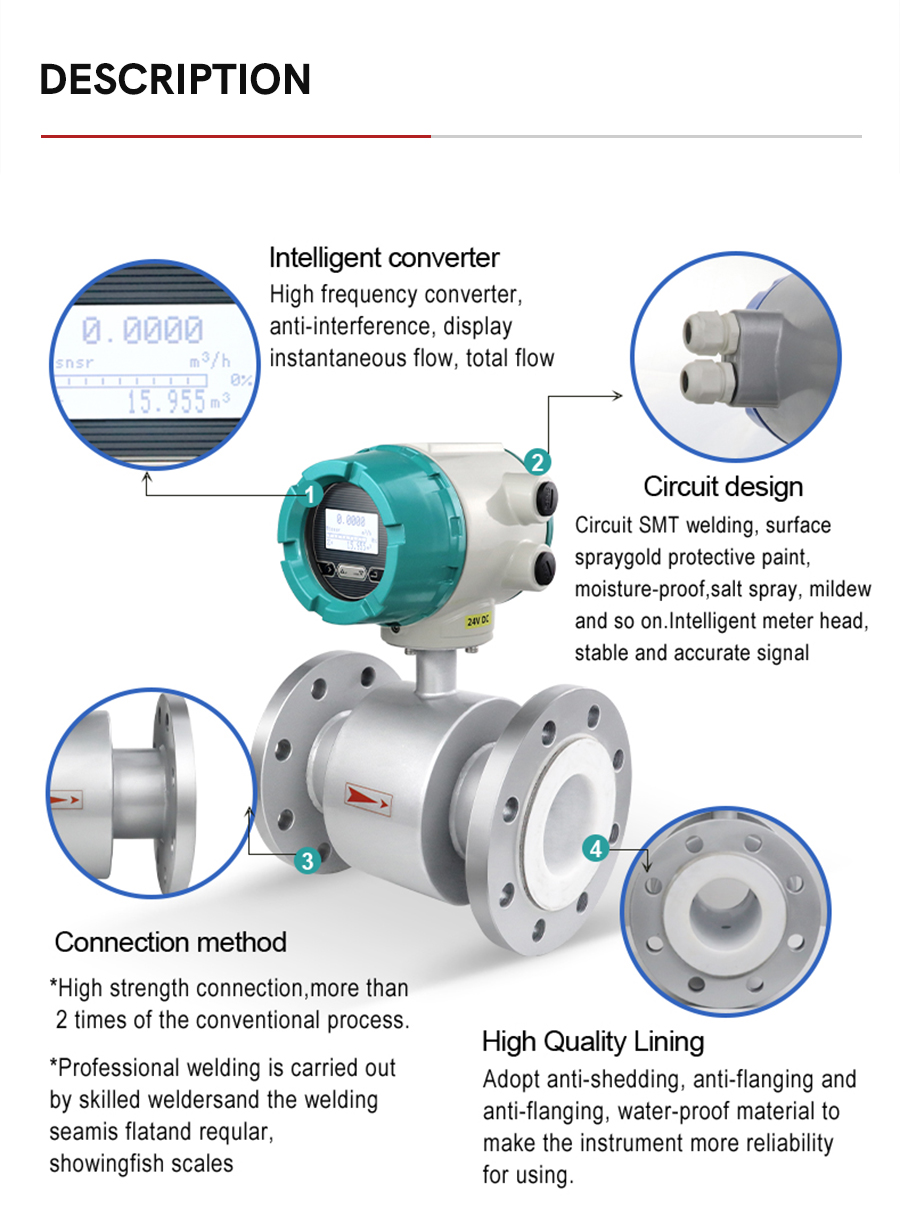 Intelligent electromagnetic flowmeter is an intelligent electromagnetic flowmeter developed by our company with the most advanced technology at home and abroad.The electromagnetic converter core USES high speed CPU.The calculation speed is very fast, the precision is high, the measurement performance is reliable.The input impedance is up to 1015 ohms, the common mode rejection ratio is better than 100db, and the interference rejection capacity of 60Hz/50Hz is better than 90db, which can measure the flow rate of fluid medium with lower conductivity.The sensor adopts the non-uniform magnetic field technology and the special magnetic circuit structure, the magnetic field is stable and reliable, and greatly reduces the volume, reduces the repetition, makes the flowmeter small flow quantization characteristic.